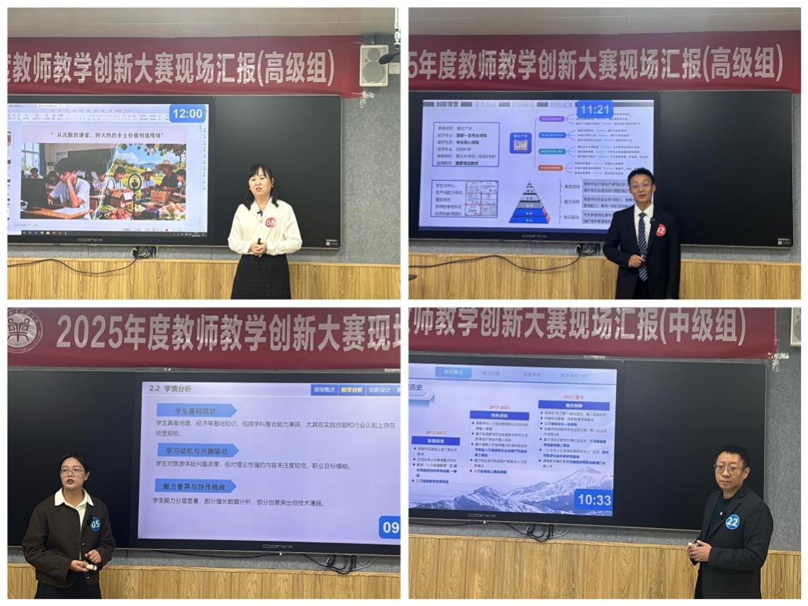 校级决赛中,参赛教师聚焦课程教学创新实践,深入剖析教学中存在的“真问题、真难点”,围绕教学内容重构、教学方法革新、教学资源建设、教学评价改革、AI赋能教学等方面,展示课程创新举措及成效与推广应用情况。专家根据参赛教师汇报情况,进行了提问交流和点评反馈。经过激烈的角逐,学校共评出特等奖5个、一等奖10个、二等奖14个。