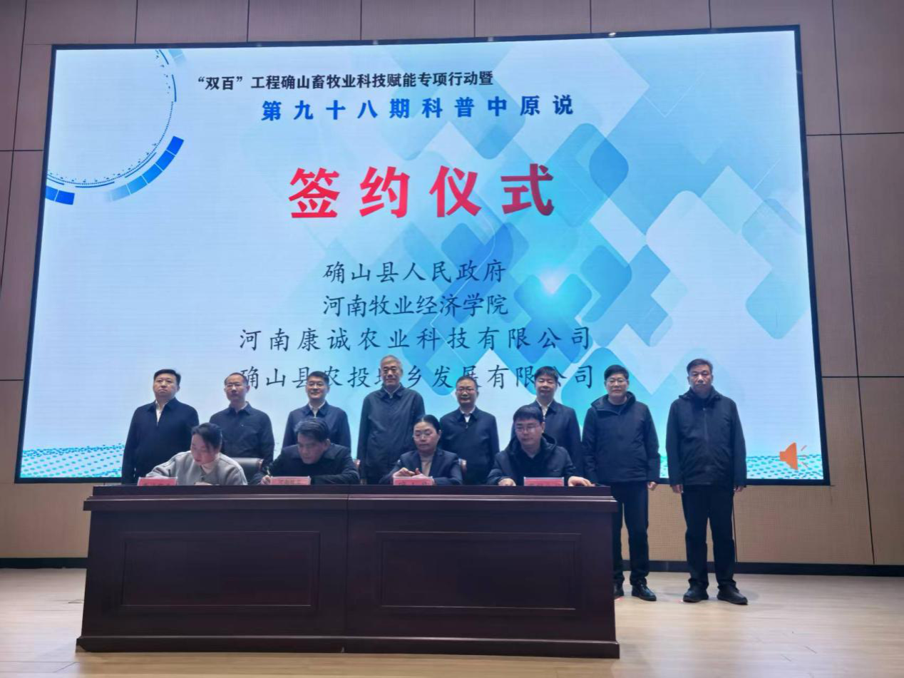 期间,我校与确山县政府、河南康诚农业科技有限公司、确山县农投城乡发展有限公司现场签订合作协议;驻马店市人力资源和社会保障局向“双百”工程河南省服务基层专家团团长、我校社会服务办公室主任胡华锋授旗;确山县政府向专家团11名成员颁发聘书。