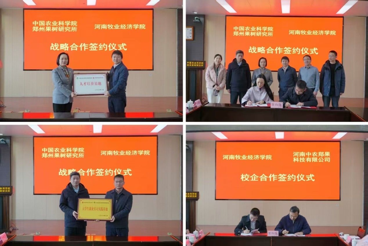 在与会领导见证下,尹新明代表学校接受郑州果树研究授予的“人才培养基地”牌匾;马珺代表学校与郑州果树研究所签署校所战略合作协议;岳彩军代表学校授予郑州果树研究所“大学生就业实习实践基地”牌匾;物流与电商学院院长任佳佳与河南中农郑果公司总经理马凌珂签署共建电商新媒体校企研发中心协议。