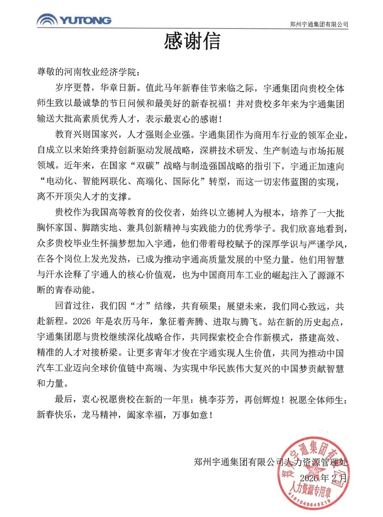 近日,郑州宇通集团专程向我校发来感谢信,对学校持续为企业输送大批高素质优秀人才表示衷心感谢,并高度评价我校毕业生在推动企业高质量发展中发挥的中坚力量作用。值此马年新春佳节来临之际,宇通集团还向全体师生致以诚挚问候与美好祝福。