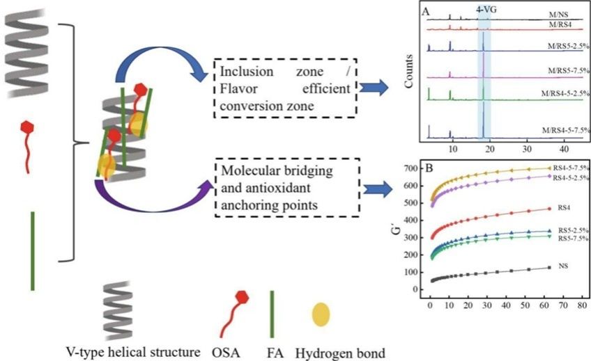这两项研究分别聚焦于肉类风味改良与淀粉益生元功能开发,通过创新的物理加工手段,为副产物精深加工与精准营养食品开发提供了全新的理论依据和技术方案。其中,发表于1月份的题为“Synergistic construction of OSA-ferulic acid composite starch: Structural evolution, gel properties, and its regulation on lamb meat flavor”的研究,团队通过辛烯基琥珀酸酐(OSA)的空间位阻效应,将天然抗氧化剂阿魏酸(FA)通过氢键锚定于淀粉网络,成功构建了凝胶强度显著提升的OSA-FA复合淀粉(RS4-5)。该淀粉在羊肉丸应用中表现出三重调控功能:通过抑制脂肪氧化(TBARS值最低)减少异味醛类生成;通过多孔凝胶网络物理封装异味;同时促进特征风味物质4-乙烯基愈创木酚的生成,为肉类风味改良提供了全新解决方案。