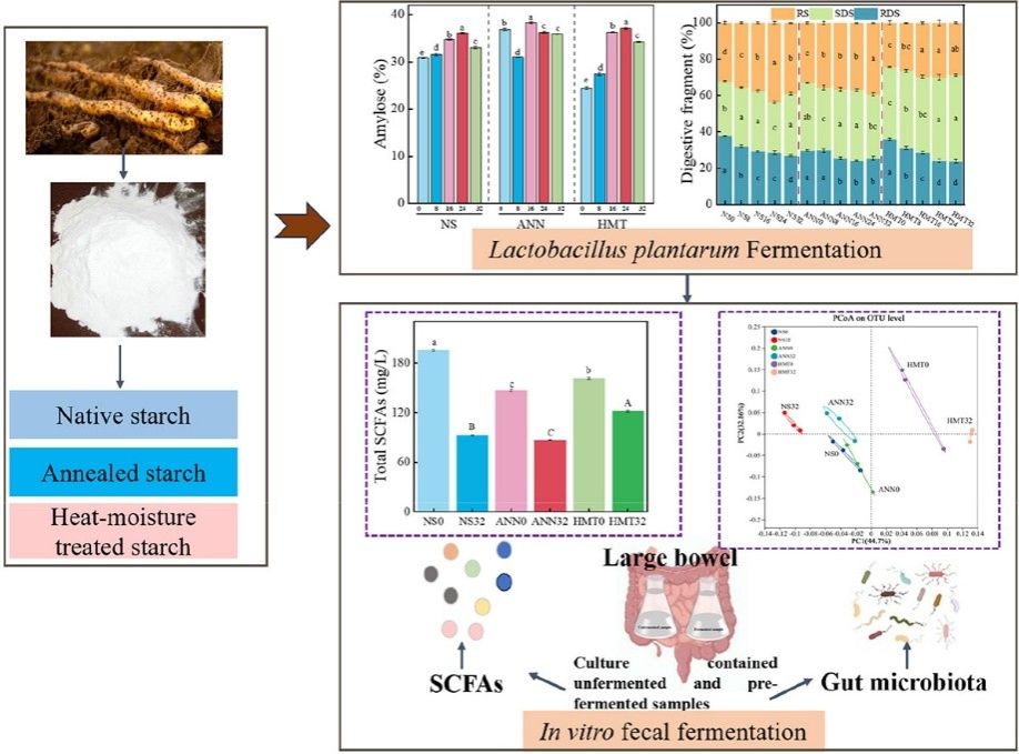 发表于2月份的题为“Comparative study of annealed and heat-moisture treated starch: Structural properties and prebiotic functionality after Lactobacillus plantarum fermentation”的研究,则以怀山药淀粉为对象,深入比较了微生物改性处理对韧化处理(ANN)和湿热处理(HMT)淀粉的结构及其后续发酵特性的影响。研究发现,经过湿热处理(HMT)的淀粉在微生物发酵过程中表现出独特的“缓释”特性,能够更有效地调节肠道菌群结构。这一发现证实,物理加工结合微生物发酵是提升淀粉益生元功能的有效策略,为精准营养干预提供了新的候选原料。