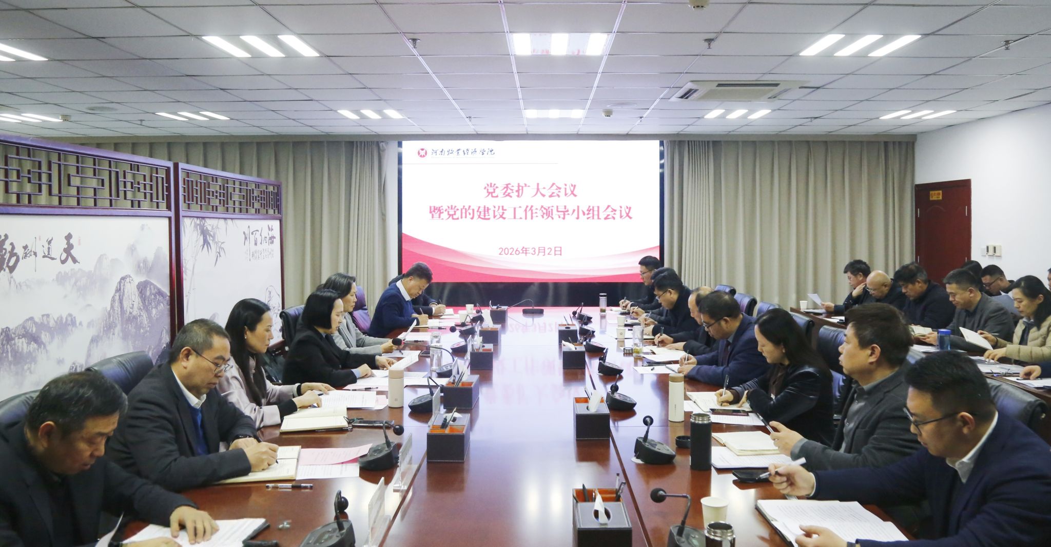 3月2日,学校在龙子湖校区图书馆841会议室召开党委扩大会议暨党的建设工作领导小组会议,深入学习贯彻习近平总书记关于树立和践行正确政绩观的重要论述,贯彻落实中央党的建设工作领导小组会议和省委常委扩大会议暨省委党的建设工作领导小组会议精神,部署启动学校学习教育工作。会议由学校党委副书记、校长尹新明主持。